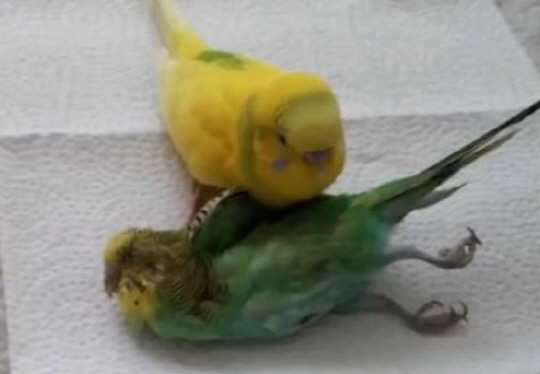 주인이 키친타올 위에 놓인 죽은 새를 치우려 하자, 노란 새는 주인의 손가락을 공격하는 등 동료를 지키는 행동을 보였다.