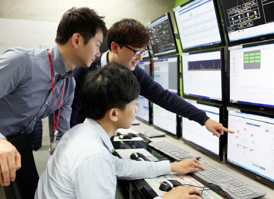 SK텔레콤이 16일 전송망 가상화 기술인 'T-SDN'을 전송망 장비 일부에 적용해 상용화 서비스를 시작했다. SK텔레콤의 구성원들이 보라매 사옥에 위치한 네트워크 가상화 센터인 'IPC'에서 각종 가상화 기능들을 점검하고 있다.