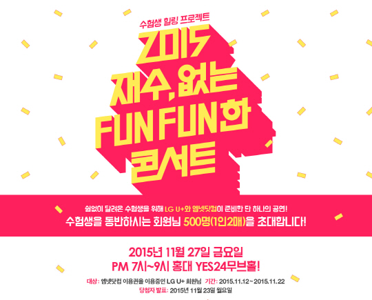 LG유플러스(부회장 이상철)가 16일 CJ E&M과 공동으로 대학수학능력시험 준비로 지친 수험생을 위해 '2015 재수(再修)없는 FunFun한 콘서트'를 오는 27일 홍대 예스24무브홀에서 개최한다고 밝혔다.