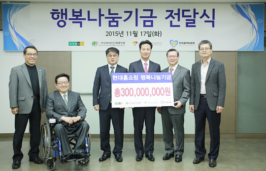 현대홈쇼핑이 17일 서울 여의도 장애인단체총연맹 대회의실에서 보험 방송을 통해 모금한 '행복나눔기금' 3억원을 장애인재활협회, 혈액암협회, 장애인단체총연맹에 전달했다.