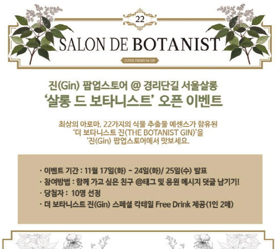 '살롱 드 보타니스트'는 최근 국내 소비자들 사이에서 뜨거운 관심을 받고 있는 더 보타니스트 진을 적극적으로 알리고, 소비자들에게 더 많은 시음 및 체험 기회를 제공하고자 마련한 특별 공간이다. 이태원 경리단길에 위치한 국내 유일의 진(Gin) 펍 '서울 살롱' 매장을 개조해 보타니스트 진과 스페셜 진 칵테일을 판매하며, 다양한 인스토어 프로모션도 진행할 예정이다. 살롱 드 보타니스트는 내년 4월 말까지 총 6개월 간 운영된다.