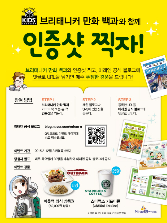 '브리태니커 만화 백과와 함께 인증샷 찍자!' 이벤트는 개인 SNS에 브리태니커 만화 백과 가이드북 또는 본책 인증샷을 찍어 업로드한 후 해당 URL을 미래엔 공식 블로그(blog.naver.com/mirae-n) 이벤트 페이지에 댓글로 남기면 된다. 12월 31일까지 매주 목요일 30명씩 추첨해 5명에게 5만원 상당의 아웃백 외식상품권, 25명에게는 스타벅스 기프티콘 등을 제공한다.