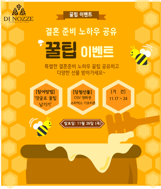 고품격 웨딩문화공간 디노체컨벤션이 예비 부부들을 위해 결혼준비 노하우를 공유하는 꿀팁 이벤트를 진행한다.