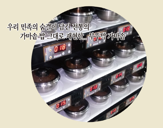 또한 이 대표는 "솥밥의 장점인 구수한 누룽지의 향수는 많은 이들로 하여금 한끼 식사의 짧은 시간 속에서도 큰 만족감을 줄 수 있을 것이며, 이 누룽지의 양과 함께 밥의 질고 된 상태마저도 조절이 가능하다"며 부뚜막 가마솥의 기능에 대해 전했다. 실제로 각종 영양밥과 특수밥을 지을 수 있는 기능마저도 탑재가 되어있는 부뚜막 가마솥은 잡곡밥, 나물밥, 굴밥등 수많은 재료들을 가지고 새로운 메뉴를 개발할 수도 있다는 특장점을 통해 현재 업계에서 많은 사랑을 받고 있다.