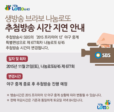 나눔로또는 지난주에 이어 11월 21일 추첨방송사 SBS의 '2015 프리미어 12' 야구 중계로 인해 제677회 나눔로또6/45 추첨 방송 시간이 지연된다고 밝혔다.
