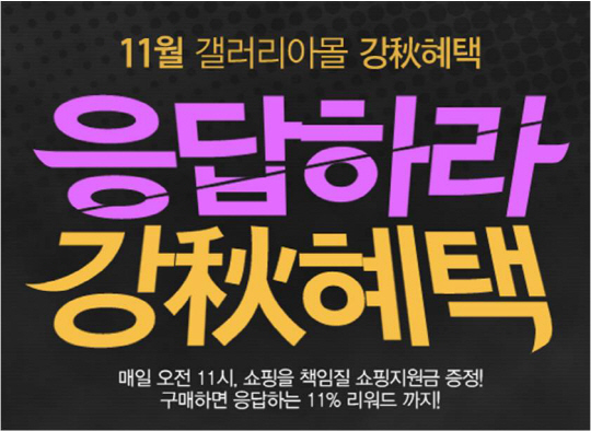 30일까지 진행되는 '응답하라 강추(秋)혜택' 이벤트는 매일 오전 11시부터 선착순 500명을 대상으로 쇼핑전환금 1100원을 증정한다. 쇼핑전환금은 갤러리아몰에서 즉시 현금처럼 사용 가능하다. 기간 내에 갤러리아몰에서 결제금액 기준 10만원 이상 구매한 고객 110명을 추첨하여 결제 금액의 최대 11%를 쇼핑전환금으로 리워드 해준다. 이번 이벤트는 리워드를 신청한 고객에 한하며, 리워드 한도 최대 2만원까지 지원된다. 당첨자는 12월 16일 갤러리아몰 사이트와 모바일앱을 통해서 확인할 수 있다.