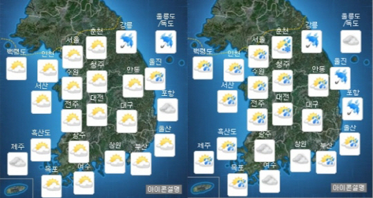 강원도영동과 경상남북도동해안은 동풍의 영향으로 흐리고 비가 오겠고 강원산간과 강원북부동해안, 경북북부는 비 또는 눈이 내릴 전망이다.