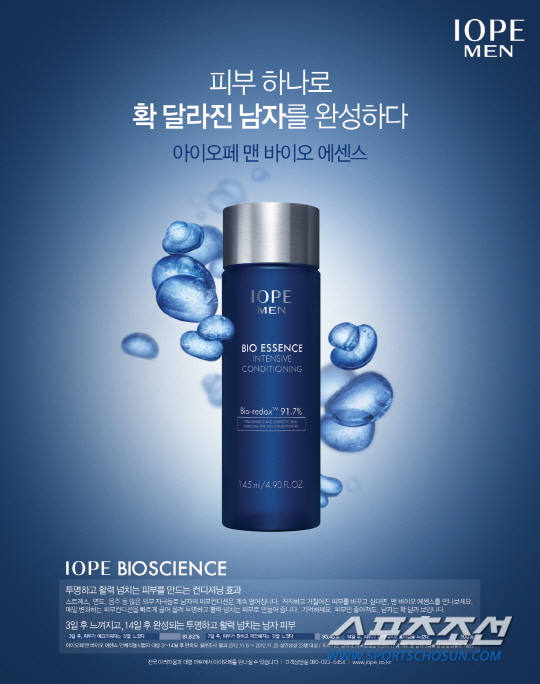 '아이오페 맨 바이오 에센스-피부 하나로 확 달라진 남자를 완성한다'는 광고는 남성 소비자들은 여성 소비자들에 비해 평상 시 스킨케어에 할애하는 노력과 시간이 적기 때문에, 조금만 신경 써서 관리해도 피부 상태가 확 좋아진다는 소비자 인사이트에서 출발했습니다. 아울러 워터 타입 에센스임을 효과적으로 전달하기 위해 제품 텍스처를 시각화했으며, 바디 카피에 구체적인 임상 실험 결과를 포함해 아이오페 바이오사이언스에 대한 신뢰와 믿음을 높이고자 했습니다.