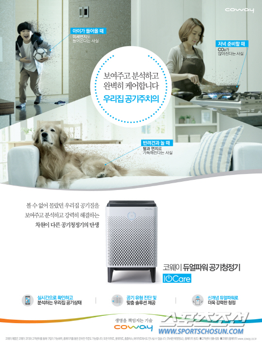 올해 출시한 '듀얼파워 공기청정기 IoCare'는 코웨이의 혁신을 보여주는 대표 제품으로 사물인터넷(IoT)을 연계해 실내 외 공기상태를 실시간으로 보여주고, 우리 집 공기의 전문적인 진단 분석을 통해 맞춤형 솔루션까지 제공해주는 제품입니다.