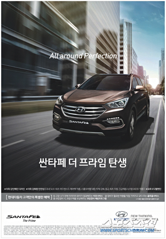 내외관 및 안전 편의 주행사양 모두 전면적으로 개선한 싼타페 더 프라임은 종합적으로 높아진 상품적 완성도를 'All around Perfection'이라는 커뮤니케이션 슬로건으로 표현해 국내 SUV로서의 리더십과 자신감을 나타내고자 하였습니다.