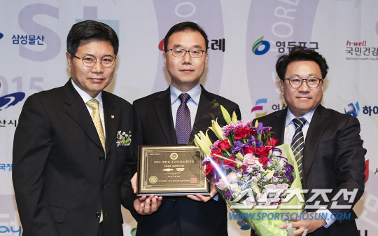 한국지엠주식회사(이하 한국지엠)는 25일 서울 태평로 프레스센터에서 개최된 한국인터넷소통협회 (KICOA) 주관, 제 8회 대한민국 인터넷 소통 대상 시상식에서 기업부문 '인터넷 소통 대상'을 2년 연속 수상했다. 한국지엠 기업홍보담당 김상원 상무(가운데)가 홍문종 국회 미래창조과학방송통신위원회 위원장(왼쪽), 박영락 한국인터넷소통협회 회장과 함께 기념사진을 찍고 있다. 사진제공=한국지엠
