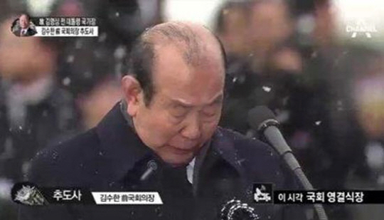 이어 김 전 대통령 평생 동지인 김수한 전 국회의장이 추도사를 읽어 내려갔다. 김 전 의장은 "김 전 대통령은 국민을 사랑하고 섬긴 진정한 문민정치가였고, 퇴임후에도 대한민국 정통성과 정체성을 지킨 든든한 버팀목"이였다고 추모했다. "존경하고 사랑하는 대통령님 수고 많으셨다" 는 부분에서는 울먹이며 애통해했다.
