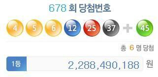 나눔로또는 제678회 로또복권 추첨에서 '4, 5, 6, 12, 25, 37'이 1등 당첨번호로 뽑혔다고 28일 밝혔다.