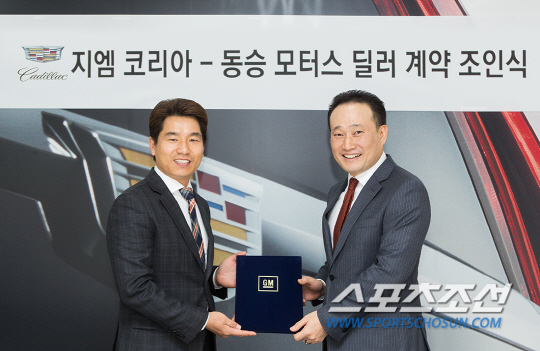 | 지엠코리아 장재준 캐딜락 총괄사장(오른쪽)이 동승모터스 이재영 사장과 수원 전시장 오픈을 위한 공식 딜러 계약을 한 뒤 포즈를 취하고 있다. 사진제공=제임코리아 |