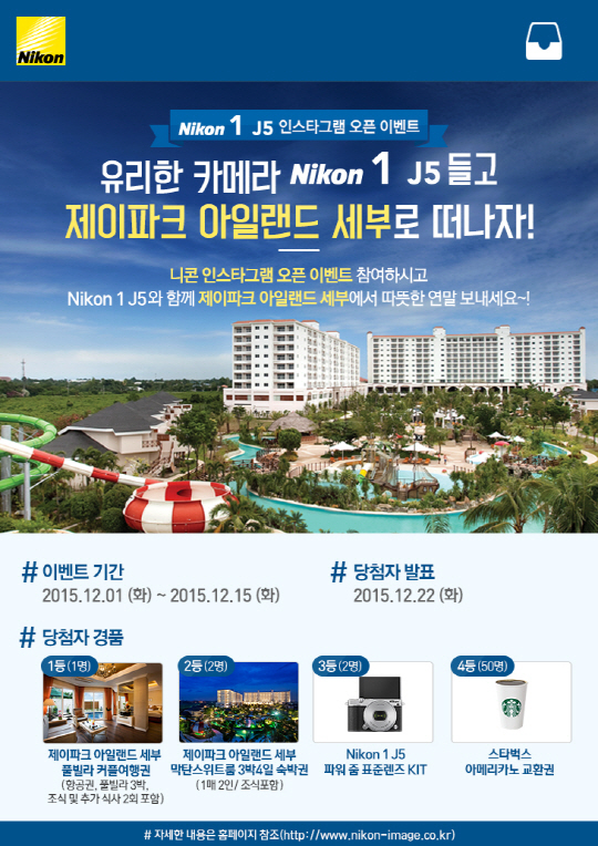 이벤트는 12월 15일까지 진행되며, 당첨자 발표는 12월 22일이다. 추첨을 통해 1등과 2등에게는 각각 제이파크 아일랜드 세부 풀빌라 커플여행권과 막탄스위트룸 3박 4일 숙박권, 3등과 4등에게는 각각 Nikon 1 J5 표준 줌렌즈 킷과 스타벅스 커피 기프티콘 등 푸짐한 경품을 증정한다.