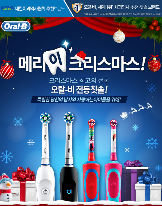 오랄-비가 2016년 1월 3일까지 G마켓, 옥션 및 11번가 등 주요 온라인 오픈마켓에서 자사의 대표 전동칫솔 모델을 특가에 판매하는 크리스마스 특별 기획전을 진행한다. 2일 오랄-비에 따르면 기획전에는 오랄-비 역사상 가장 진화한 전동칫솔인 스마트시리즈, 실용성과 기능성을 모두 갖춘 프로3000(PRO3000) 및 어린이용 충전식 전동칫솔인 스테이지스 파워 등 독일에서 직접 제조된 전동칫솔 3종이 포함됐다. 오랄-비 스마트시리즈 구매 시 양치하는 동안 더욱 편리하게 오랄-비 앱을 통해 구강관리를 할 수 있도록 돕는 스마트폰 거치대를 포함한 한정판 기프트 케이스를 증정해 특별함을 더했다.