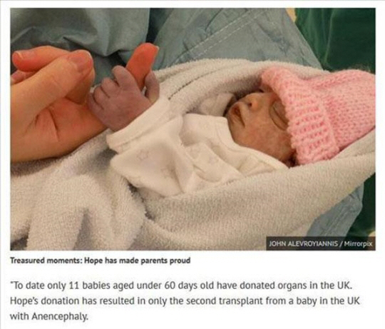 이에 의사는 낙태를 권했다. 하지만 에마는 호프가 장기기증으로 다른 이들의 생명을 구할 수 있을 것이라고 확신했고, 세상의 빛을 본 지 1시간 만에 숨을 거둔 호프는 성인 환자 한 명에게 두 신장을 이식했다. 또한 아이의 간세포는 냉동돼 간 이식을 기다리는 환자들에게 전해질 예정이다.
