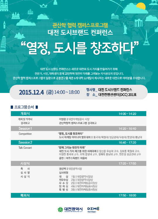 '열정, 도시를 창조하다 !'라는 주제로 진행되는 '대전 도시 브랜드 컨퍼런스'는 관산학협력캠퍼스프로그램의 일환으로, 대전 도시브랜드 가치 창출을 위해 서울 동국대, 성균관대, 중앙대, 대전 목원대, 우송대, 충남대 등 총 6개 대학의 교수와 학생들이 공동으로 연구해온 결과를 함께 공유하고 대전이 향후 나아가야 할 방향을 모색하는 자리이다.