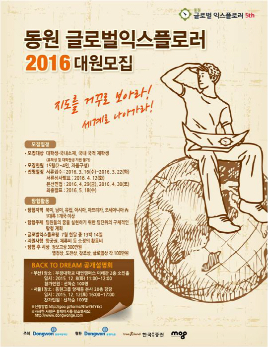 동원육영재단이 대학생 해외탐험 프로그램 '2016 동원 글로벌 익스플로러(Global Explorer)'에 참가할 대원을 모집한다.