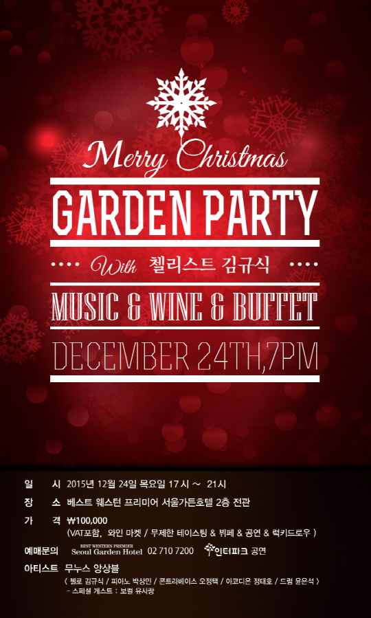 베스트 웨스턴 프리미어 서울가든호텔(www.seoulgarden.co.kr,이하 서울가든호텔)이 12월 24일 저녁 5시 2층 로비와 그랜드볼룸에서 크리스마스 파티 '크리스마스 가든파티(Christmas Garden Party)'를 개최한다.
