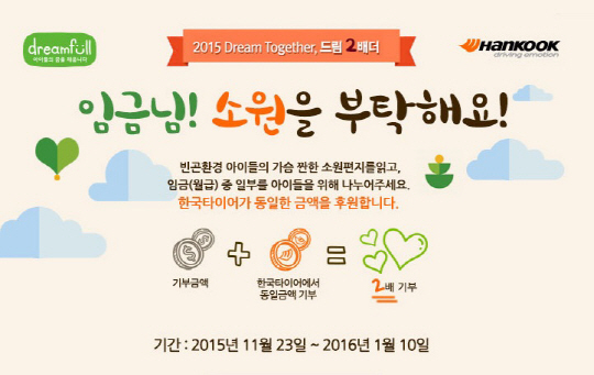 한국타이어가 온라인 기부 사이트 드림풀(www.dreamfull.co.kr)을 통해 '2015 드림 투게더, 드림 두 배 더' 캠페인을 실시한다.