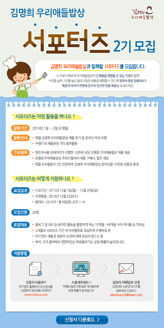 '김명희 우리애들밥상' 공식 서포터즈는 SNS와 블로그 등 온라인 활동을 즐겨하는 4개월~48개월 사이의 자녀를 둔 부모, 그리고 1월부터 3개월간의 서포터즈 기간 내 미션활동을 활발하고 성실하게 수행할 수 있는 사람이라면 누구나 참여가 가능하다. 모집 기간은 20일까지 진행되며 미즈앤코 홈페이지(www.miznco.com)에서 지원서를 다운받아 메일(planning123@naver.com)로 접수하면 된다. 자세한 사항은 전화(070-4861-3123)로 문의하면 된다.