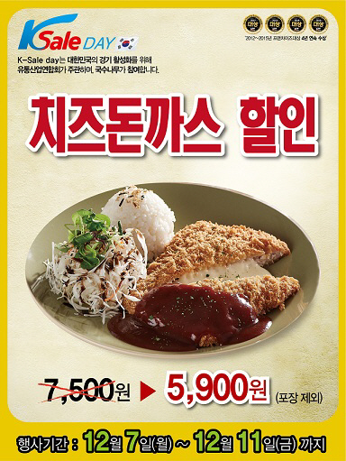 국수나무가 11일까지 K-Sale Day 행사를 진행한다고 9일 밝혔다. 국수나무에 따르면 전국 매장에서 치즈돈까스를 5900원에 구입이 가능하다(일부 매장 제외). K-Sale DAY는 대한민국의 경기 활성화를 위해 민간협의체인 유통산업연합회가 주관하는 대규모 합동 할인행사다. 유통과 외식업계의 자발적인 참여로 이루어지며 목적은 경기 활성화 및 내수침체 극복이다. 산업통상자원부, 기획재정부, 중소기업청에서 후원하는 대한민국 유통산업 주간 쇼핑데이로 올해로 두돌을 맞았다.