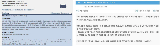 심지어 6개월이 지나서 국내 리콜된 사항도 있었다. 지난 9월 7일 국토교통부는 FCA코리아가 수입·판매한 지프그랜드체로키 일부 모델을 제작결함으로 리콜한다고 밝혔다.