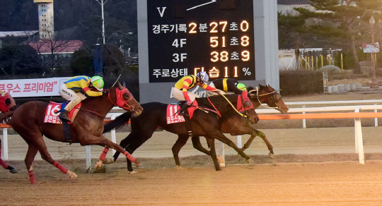 ◇'볼드킹즈(오른쪽)'가 13일 경기도 과천의 렛츠런파크서울에서 열린 제34회 그랑프리 경주에서 결승선을 통과하고 있다. 사진제공=한국마사회