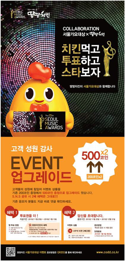 땅땅치킨이 서울가요대상 초대권 이벤트를 진행한다고 15일 밝혔다. 땅땅치킨 관계자는 "치킨은 스포츠, 문화 콘텐츠 등과 긴밀한 관계에 있는 음식"이라며 "스포츠·문화 산업 진흥에 도움이 될 수 있도록 제25회 서울가요대상의 협찬사 중 하나로 참여, 축제가 성황리에 끝마칠 수 있도록 지원할 계획"이라고 말했다.
