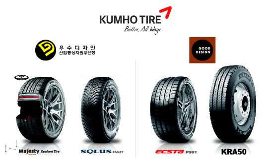 수상의 영예를 안은 '엑스타 PS91'은 고성능 슈퍼카에 최적화된 S-UHP(Super-Ultra High Performance) 타이어로 트레드(바닥면)와 사이드월에 레이싱 깃발 로고를 새겨 역동적인 디자인이 돋보이는 제품이다. 또한 트럭·버스용 타이어인 'KRA50'은 넓은 센터 블록 디자인으로 블록의 좌우 흔들림을 줄여 편마모가 최소화 되도록 설계된 전·후륜용 타이어이다. 번개 모양을 모티브로 삼은 트레드 디자인으로 디자인 측면뿐만 아니라 주행성능도 향상시켰다.