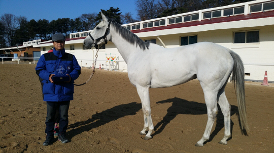 한국마사회 말산업인력개발원 경마아카데미가 지난달 27일 피터 힐 페가수스 목장장으로부터 '고스트위스퍼(7세·거세마)'를 교육마로 기증받았다.