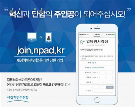 한편 새정치연합은 온라인으로 입당신청을 받을 수 있는 시스템(join.npad.kr)을 구축, 16일부터 입당 신청을 받기 시작했다. 국내 정당사상 최초다. <스포츠조선닷컴>