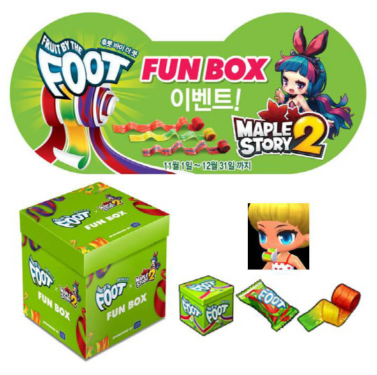 제품에 들어있는 아이템 코드는 실제 메이플스토리2에서 에너지 회복, 몸집증가, 캐릭터 꾸미기 등으로 활용 가능하며 럭키드로우 처럼 무엇이 나올지 모르는 이벤트팩까지 다양하게 구성됐다. 최근 개그우먼 박나래가 자신의 SNS 계정에 후룻 바이 더 풋 Fun Box 인증샷을 올려 화제를 모으기도 했다.
