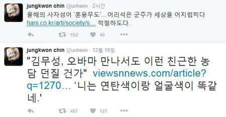 한편 진중권 교수는 앞서 지난 18일에도 자신의 트위터를 통해 "김무성, 오바마 대통령 만나서도 이런 친근한 농담 던질 건가"라고 일침을 놓기도 했다.