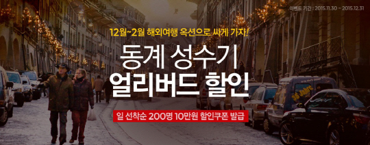 31일까지 진행되는 이번 프로모션에서 12월부터 2월까지의 동계 기간 해외여행 상품을 할인 가격으로 판매한다. 이와 함께 매일 200명에게 10만원 할인쿠폰을 발급하는 이벤트도 진행한다.