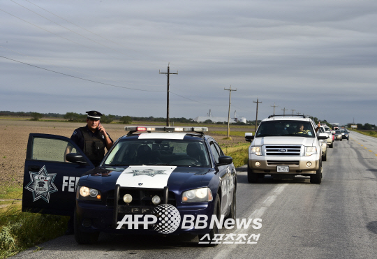 TO GO WITH AFP STORY BY SOFIA MISELEM A Federal Police patrol car escorts vehicles with civilians along the gang-infested Matamoros-Ciudad Victoria highway, Tamaulipas State, Mexico, in the border with the United States, on December 16, 2015. AFP PHOTO/RONALDO SCHEMIDT