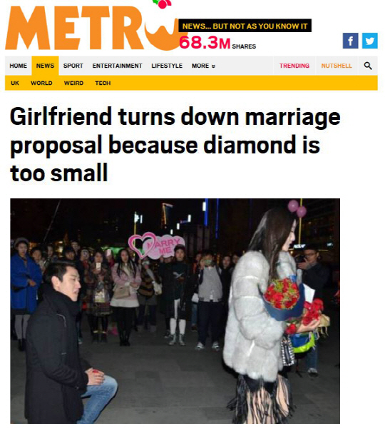 소식을 접한 해외 네티즌들은 "차라리 잘됐다. 헤어져라", "여성이 너무 이기적인 것 아닌가?", "남성이 더 큰 다이아 반지를 준비할까?" 등의 반응을 나타냈다.
