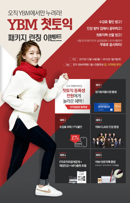 이번 이벤트는 2016년 1월 9일까지 전국 YBM어학원 19개 센터에서 동시 진행된다. YBM어학원은 방문 혹은 온라인 접수를 통해 1월 토익 입문반 과정을 등록하는 수강생에게 수강료 최대 17% 할인 혜택을 제공한다. 등록생 전원에게 토익응시권, YBM CLASS 인강, ETS 토익 미공개문제 및 온라인 해설 강의를 증정해 첫 토익 시험에 완벽히 대비할 수 있도록 했다. 토익 시험용 샤프와 지우개, 필통으로 구성된 'YBM 첫토익팩'을 선물로 증정한다. 더불어 YBM어학원은 1월 토익 강좌 등록생 전원에게도 토익 출제기관 ETS에서 제작한 최신 미공개 문제집 및 온라인 해설 강의, MP3 음원을 제공한다.