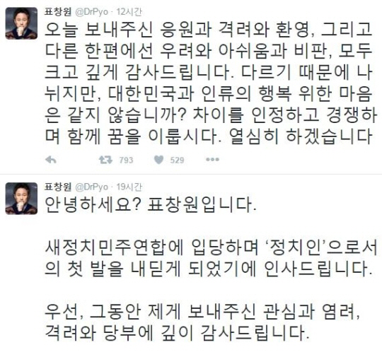27일 표창원 전 경찰대 교수가 자신의 트위터를 통해 새정치민주연합에 입당 사실을 알렸다. 그는 "새정치민주연합에 입당하며 '정치인'으로서의 첫 발을 내딛게 되었기에 인사드립니다"라며 정치인으로서의 첫 인사를 남겼다.