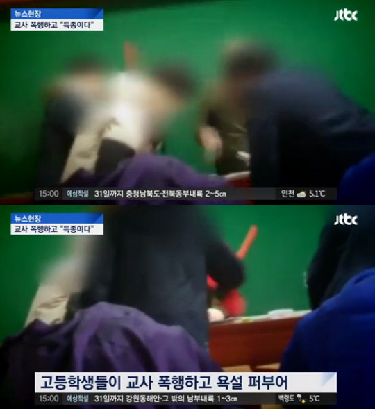 최근 각종 SNS와 온라인커뮤니티를 통해 빠르게 확산되고 있는 일명 '교사 폭행사건' 영상은 충격적이다. 영상에는 한 남학생이 교단 앞으로 나오더니 빗자루로 교사의 팔을 때리기 시작하더니 "야, 이 XXX아!"라는 막말을 하는가 하면 손으로 머리를 밀치고, 침을 뱉는다.