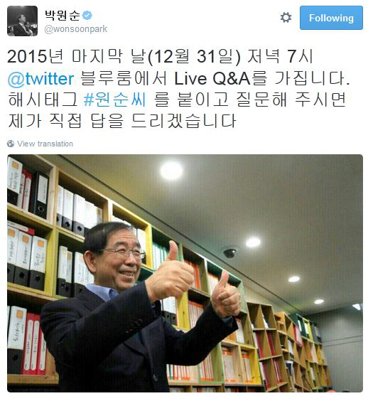 트위터 코리아에 따르면 31일 오후 7시부터 진행되는 이번 행사는 박원순 시장의 트위터 공식 계정(https://twitter.com/wonsoonpark)을 통해 누구나 실시간으로 질문과 답변을 확인할 수 있다. 질문을 올리려면 궁금한 점과 함께 해시태그 '#원순씨'를 넣어 트윗하면 된다. 지난 28일 박 시장의 트위터에 Q&A 공지가 국문과 영문으로 동시 게시된 후 국내 이용자들은 물론 로이터 통신의 제임스 피어슨 기자 등 해외에서도 질문이 올라오고 있다.