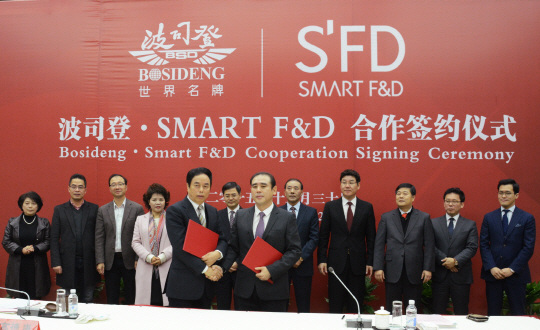 스마트에프앤디 심규현 대표이사(右)와 보스덩그룹 까오더캉 회장(左)이 계약서에 서명한 후 악수를 나누고 있다.