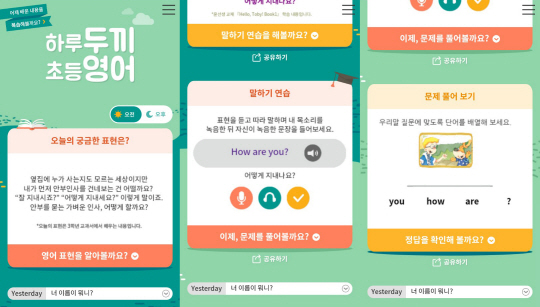 콘텐츠 주제도 매우 다양하다. 초등영어 교과 중 일상에서 흔히 쓰이는 60가지 주제를 엄선해 주제별로 2종의 영어표현 콘텐츠를 구성했다. 각 콘텐츠마다 초등 몇 학년 과정에 나오는 표현인지를 별도로 표시해주기 때문에 학습 난이도 조절이 용이하다. 부모가 두끼영어 앱을 이용할 경우에는 자녀 학년에 해당되는 콘텐츠를 가지고 아이와 함께 학습해볼 수 있고, 아이는 영어 공교육에 대한 선행학습 및 반복학습이 가능하다.