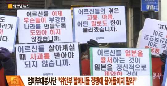 엄마부대는 "위안부 문제는 과거 한국이 힘이 없을 때 발생한 사건이고, 국력이 그만큼 강해졌기 때문에 이번 합의도 이끌어낼 수 있었던 것"이라며 "한국이 더 강한 나라가 될 수 있도록 위안부 할머니들이 희생해달라"고 말했다.