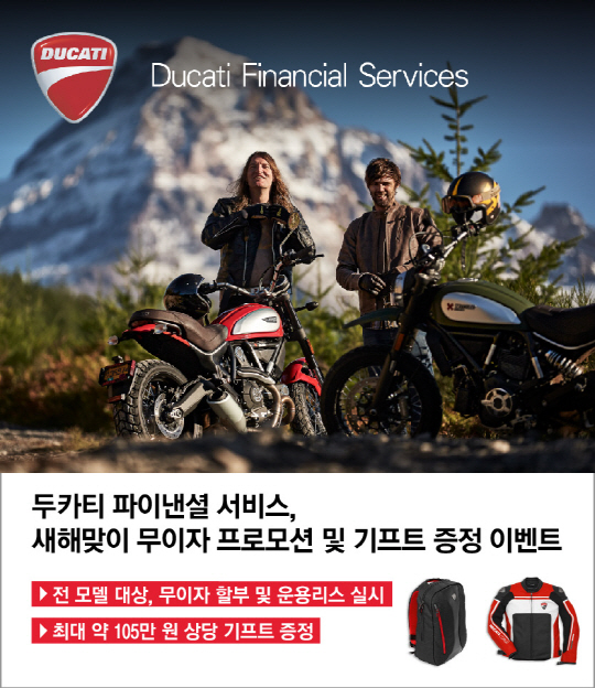 두카티 파이낸셜 서비스는 1월 한달간 전 모델 대상 무이자 할부 및 운용리스 프로모션과 함께 구매 및 상담 고객에게 약 105만원 상당의 두카티 정식 고급 자켓 등 다양한 새해 선물을 증정하는 특별 프로모션을 두카티 코리아와 공동으로 실시한다.