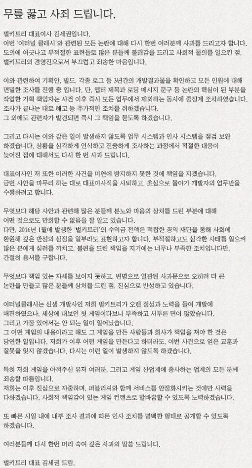 상황이 심각해지자 퍼블리셔 네시삼십삼분 장원상, 소태환 공동대표는 공식사과문을 통해 '깊은 사과의 말씀 드린다. 게임 유통 및 검수책임자에 대해 징계했고, 게임 광고를 모두 중단하겠다. 또 벌키트리에 법적책임까지 물겠다'며 진화에 나섰고, 김세권 대표가 9일 재차 사과문을 발표하고 사태 해결 후 대표직에서 사퇴하겠다고 밝혔다. 김 대표는 '논란의 핵심 책임자를 모든 업무에서 제외시키는 중징계를 했고 다른 관련자도 발견되면 책임을 묻겠다'며 '1월에 발생한 모든 수익금을 공익재단을 통해 사회에 환원하겠다. 부적절하고 심각한 사태를 일으켜 모든 분들께 죄송하다. 간절한 용서를 빈다'고 호소했다. <스포츠조선닷컴>
