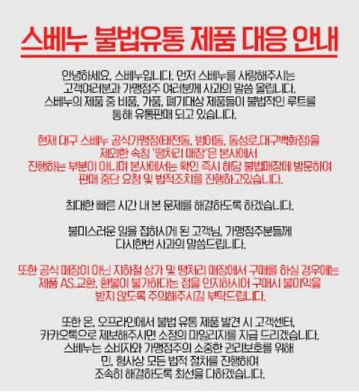 이어 "현재 대구 스베누 공식가맹점(태전동, 범어동, 동성로, 대구백화점)을 제외한 속칭 '땡처리 매장'은 본사에서 진행하는 부분이 아니며 본사에서 확인 즉시 해당 불법매장에 방문해 판매 중단 요청 및 법적조치를 진행하고 있다"라고 강력하게 말했다.