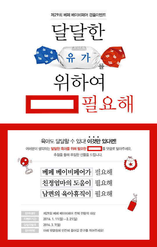 베페 이근표 대표는 "달달하고 행복한 육아를 위해 필요한 것에 대한 다양한 의견을 댓글로 공유, 육아가 결코 어렵기만 한 일은 아님을 전달해 많은 엄마, 아빠를 응원하고자 이벤트를 기획했다"며 "이벤트 참여를 통해 경품 혜택의 즐거움도 누리시고, 행복하고 달달한 육아를 위한 유용한 정보와 육아용품을 한 자리에서 만나볼 수 있는 제29회 베페 베이비페어에 많은 관심 바란다"고 말했다.