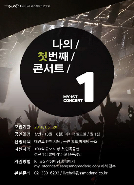 참가 신청은 KT&G상상마당 홈페이지(http://my1stconcert.sangsangmadang.com)를 통해 할 수 있다. KT&G는 심사를 거쳐 선발된 이들에게 음향 시설, 공연 홍보 등을 무료로 지원하고 저렴한 대관료로 무대에 설 수 있는 기회를 제공한다. 공연은 3월부터 10월까지 매월 마지막 주 일요일마다 서울 서교동에 위치한 KT&G상상마당 라이브홀에서 열린다.
